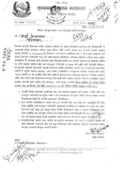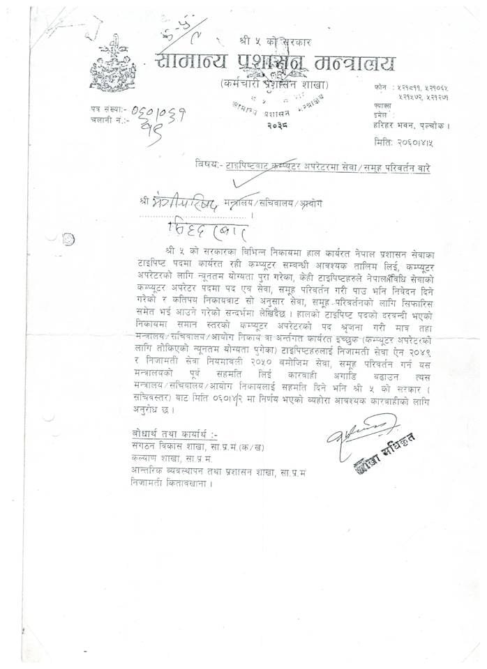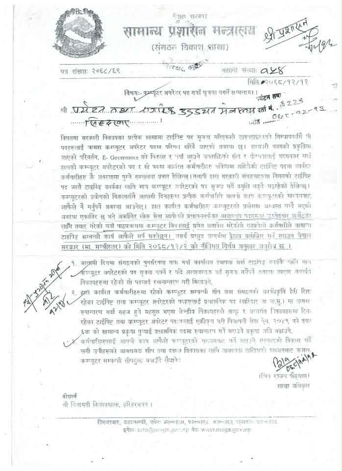 नेपाल सरकारले लोक सेवा आयोगको विज्ञापन पश्चात निजामती सेवा नियमावली, २०५० को नियम ८८ मा संशोधन गरी विविध सेवाका कम्प्यूटर अपरेटरहरूलाई नेपाल प्रशासन सेवामा बढुवा हुने व्यवस्था गरेको छ। उक्त व्यवस्था हालसम्म कार्यान्वयनमा रही निरन्तर रूपमा बढुवा हुँदै आएको विद्यमान अवस्था छ।