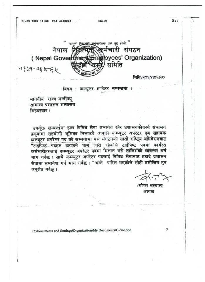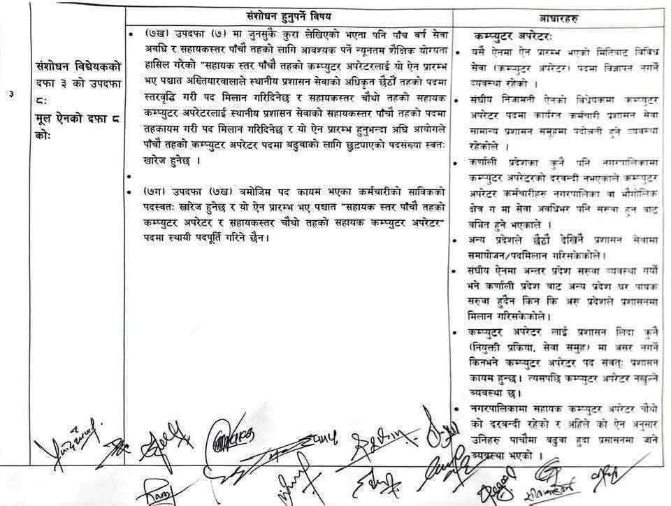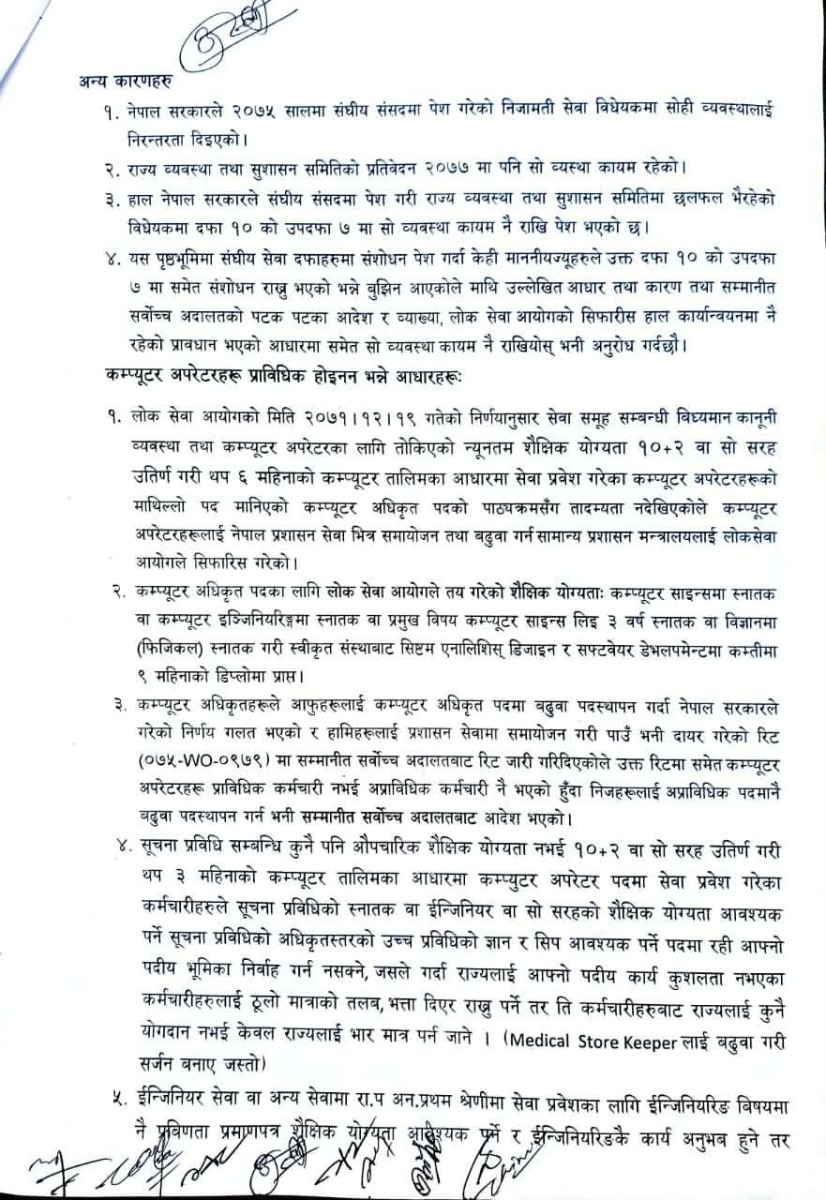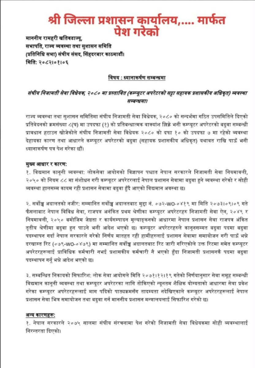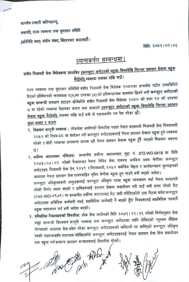 संघीय निजामती सेवा विधेयक, २०८३ मा विविध सेवा अन्तर्गतका कम्प्यूटर अपरेटरहरूको बढुवा सम्बन्धी व्यवस्थामा परिवर्तन गर्ने विषयप्रति हाम्रो गम्भीर ध्यानाकर्षण भएको छ। हाल प्रचलित कानुनी व्यवस्था, सम्मानित सर्वोच्च अदालतका आदेशहरू तथा सम्बन्धित निकायहरूको सिफारिश समेतका आधारमा विविध सेवाका कम्प्यूटर अपरेटरहरूलाई प्रशासन सेवा समुहमा बढुवा हुने व्यवस्था यथावत राखिदिनु हुन विनम्र अनुरोध गर्दछौं।