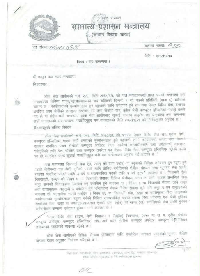 लोक सेवा आयोगले मिति २०७१।१२।१९ को निर्णयमार्फत कम्प्यूटर अपरेटरहरूको सेवा प्रवेशको न्यूनतम शैक्षिक योग्यता तथा कार्यप्रकृतिको आधारमा उनीहरूलाई प्रशासन सेवा भित्र समायोजन तथा बढुवा गर्न नेपाल सरकारलाई सिफारिश गरेको छ।
