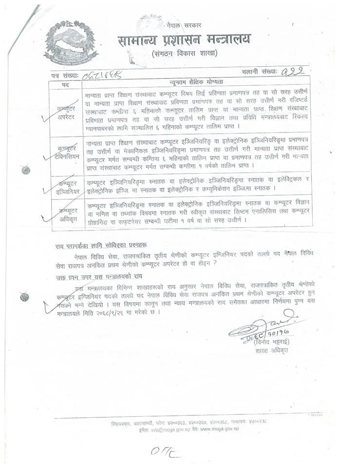 कम्प्यूटर अपरेटर पदमा सेवा प्रवेश सामान्य अप्राविधक शैक्षिक योग्यता तथा ६ महिने आधारभूत कम्प्यूटर तालिमका आधारमा मात्र हुने भएकाले उनीहरूको कार्यप्रकृति प्रशासनिक सहयोगसँग सम्बन्धित रहेको छ। यस्तो अवस्थामा उनीहरूलाई उच्च प्राविधिक योग्यता आवश्यक पर्ने सूचना प्रविधि सेवामा वर्गीकरण गर्नु उपयुक्त नहुने देखिन्छ। शिक्षा संकायबाट कक्षा १२ उत्तीर्ण गरी सीमित अवधिको (६ महिने) कम्प्यूटर तालिमका आधारमा सेवा प्रवेश गरेका कर्मचारीहरूबाट सूचना प्रविधि सेवाको उच्चस्तरीय प्राविधिक जिम्मेवारी प्रभावकारी रूपमा निर्वाह हुने अपेक्षा गर्न सम्भव नै नहुने देखिन्छ।